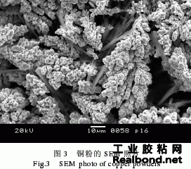 一般而言,设计复合导电材料应尽量降低聚合物相的比表面积,提高金属相的比表面积以及连通性。片状针状或带状以及纤维状金属,能够增加比表面积 和连通性 [5]。利用SEM观察所用电解铜粉(硬脂酸包覆)的形貌,结果见图3。由图3可见,该铜粉为麦穗状,显然相同粒度的麦穗状填料所形成的涂膜,其导电性能优于球状填料所形成的涂膜,这是因为麦穗状填料粒子比球状粒子有更多的接触点,易于形成三维通路,所以其形成的涂膜具有更好的导电性能。