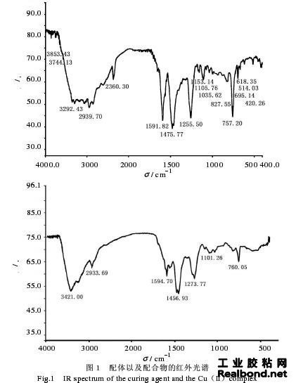 一定量的固化剂与铜粉在无水乙醇中反应,分离绿色溶液中的产物得到浅绿色粉末,测定固化剂与配合物的红外光谱。