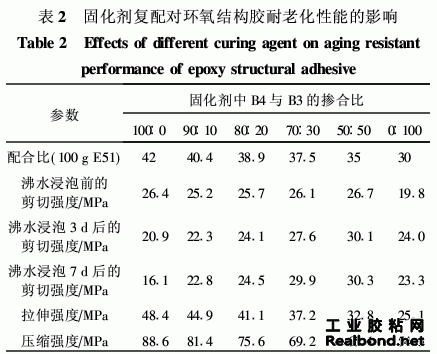 2·1 固化剂复配对环氧结构胶耐老化性能的影响在本组试验中,A组分中使用的偶联剂为KH- 550。固化剂采用B3与B4的混合料。A组分为 100g ES1时,对应不同固化剂用量时的试验结果见 表2。