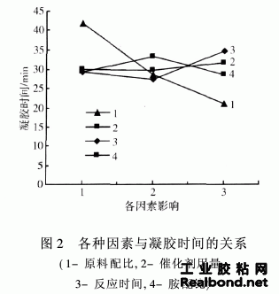 经过改性的多乙烯多胺固化剂比未改性多乙烯多胺固化 剂固化环氧树脂的速率明显加快,原因主要有2个:①改性多 乙烯多胺固化剂自身为高分子,和环氧树脂的聚合可很快就 能形成高分子而固化;②改性多乙烯多胺固化剂的胺基由于 受到吸电子基酯基的作用,碱性减弱,比未改性多乙烯多胺分 子的端基胺更易和环氧树脂的环氧基发生反应,因而可以加 速环氧树脂的固化。此外,改性多乙烯多胺中仲胺多于伯胺, 仲胺与环氧树脂交联后生成的叔胺又对反应有促进作用。依 正交分析法得到各因素与凝胶时间的关系如图2所示。从R 和F比进行分析可知,胺原料配比对改性多乙烯多胺环氧树 脂固化剂的凝胶时间影响最大,因此,胺原料配比是必须要把 握的一个重要因素。从图中可知胺配比为1∶2,反应时间为 8h,原料配比为2∶1,催化剂用量为0·5%是最佳反应条件, 实验中也得到了证实。