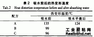 通常,EP基体分子结构中含有大量经基、胺基等极性亲水基团,故树脂基体的吸湿性强、吸湿率高,由其制取的复合材料在湿热条件下的性能显著下降网。固化物吸水前后热变形温度的变化情况如表2所示。