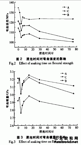 浸泡时间对弯曲强度、弯曲模量的影响如图2、 图3所示。由图2可知,浸泡过程使材料的弯曲强度有不同程度的下降l习,且下降过程呈现出相似的规 律,即在浸泡初期弯曲强度随时间的延长而急剧下降,4d后弯曲强度有小幅度上升,然后又继续降低至平衡。当达到吸水平衡时,W体系弯曲强度下降了8.5%,DMP一30体系下降了12.2%,MDXA体系下降了15.3%。