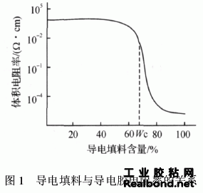 光固化导电胶固化过程的实质是自由基引发的交联反应,光引发剂是光固化体系的重要组成部分之一。 在紫外光照射下,光引发剂吸收光子,产生自由基,从而引发材料中具有反应活性物质间的化学反应(主要是聚 合反应),最终导致体型结构的形成,使材料固化。其导电机理一般认为 是在导电胶中形成导电网络。对于导电网络的形成,在20世纪70年代就有人提出了“渗滤理论(percolation theory)”。该理论认为当复合体系中导电填料的含量达到一定比率后,开始形成导电网络通道,此时电阻率会发生突降,降幅达到10个量级左右;以后导电填料继续增加,电阻率变化就很小了。这个电阻突降的填料含量临界值称为“渗滤阈值”,见图1。