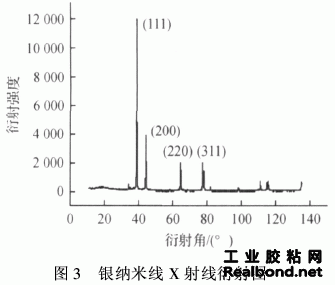 图3为银纳米线的XRD衍射图,可以看出Ag纳米线衍射峰分别对应fcc(面心立方)结构中的(111)、(200)、(220)、(311)晶面,无其他的衍射峰出现,以2θ=38°衍射峰为标准,由Voig 函数法扣除仪器展宽,分离晶格畸变影响,通过谢乐公式β=λ/ Dcosθ,计算Ag纳米线的直径为45 nm,与扫描电镜形貌图估算 相符。