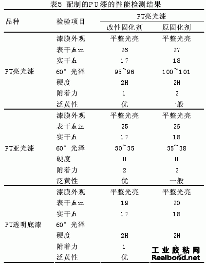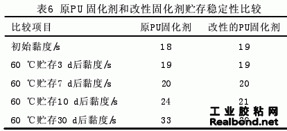 配制PU漆的漆膜性能检测结果见表5,原PU固化剂 和改性固化剂贮存稳定性比较见表6。