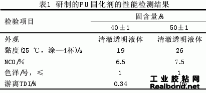 所得的聚氨酯(PU)固化剂的性能检测结果见表1。