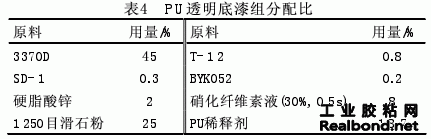按漆组分:40%固化剂:PU稀释剂=1:0.5:1配制PU透明底漆,其中漆组分配比见表4。