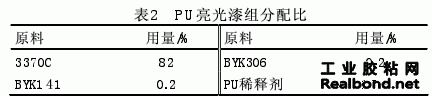 按漆组分:40%固化剂:PU稀释剂=1:1:1配制PU亮光漆,其中漆组分配比见表2。