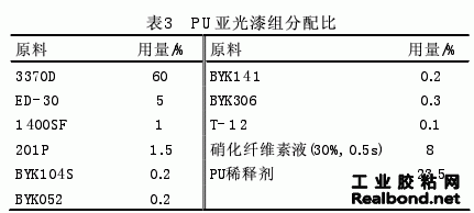 按漆组分:40%固化剂:PU稀释剂=1:0.5:1配制PU亚光漆,其中漆组分配比见表3。