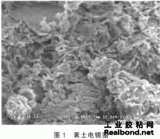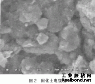 采用了电镜扫描的方法研究其对素土土颗粒形貌 的影响和是否反应产生新型结构。红砂岩素土原位电镜图像见图1。其成分为层状硅酸盐,形状不规则, 节理面不明显。固化土电镜图见图2,改良后断口相对素土平整,节理面较明显。可以看到土的结构发生了较大变化,在颗粒之间产生了许多凝胶体物质,形成凝胶团聚结构,这是固化剂加固土强度形成的关键。