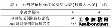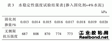 土壤经过固化以后长期遇水不会出现二次泥化 现象是固化剂工程应用中必须解决的问题[4]。本次 试验是试件在6 d龄期养护后浸水24 h,测定无侧限抗压强度,作为固化土的水稳定性评价指标,结 果见表3。