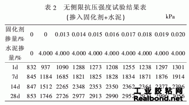 2.1.2红砂岩掺入固化剂+水泥的抗压强度试验 路邦固化剂的掺量m,分别以土和水泥质量的 0.013%、0.014%、0.015%、0.016%、0.017%、 0.018%、0.019%、0.020%制备试样,并测定不同龄期的抗压强度。结果见表2。