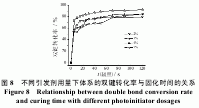 (3) 以红外光谱法考察了光固化过程中双键转化 率与辐照时间及引发剂用量的关系,确定适合该体系 的固化条件为:引发剂质量分数 3%,固化时间 70 s。