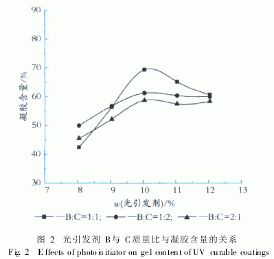 由图2可知,当光引发剂B与C的质量比为1∶1,含量为 10%时(基于HEMA质量分数,下同),凝胶含量达最大值。 当光引发剂用量低于10%,凝胶含量随引发剂浓度的增大而 增大,继续增加引发剂用量,凝胶含量反而降低。这是因为在 反应初期,自由基在反应体系中基本上是均匀形成的,此时增 大光引发剂的浓度,可以提高自由基的生成速度。但是,当光 引发剂的浓度增加到一定限度后,在靠近紫外光源的涂膜表 面产生较高的自由基浓度,由于表层自由基的过度密集,初级 自由基偶合终止和初级自由基引起的链终止几率增加,导致 固化速度下降,凝胶含量降低[5]。